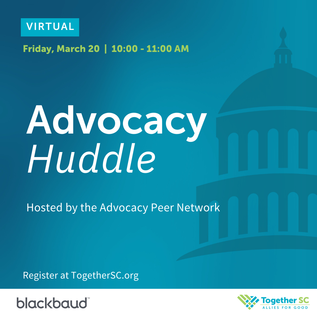 Open to Peer Network members only, Advocacy Huddles offer unstructured time for advocacy professionals to share updates on the topics most pressing to the sector in South Carolina. March's Huddle will focus will be determined based on topics of interest at the time. These sessions are not recorded.