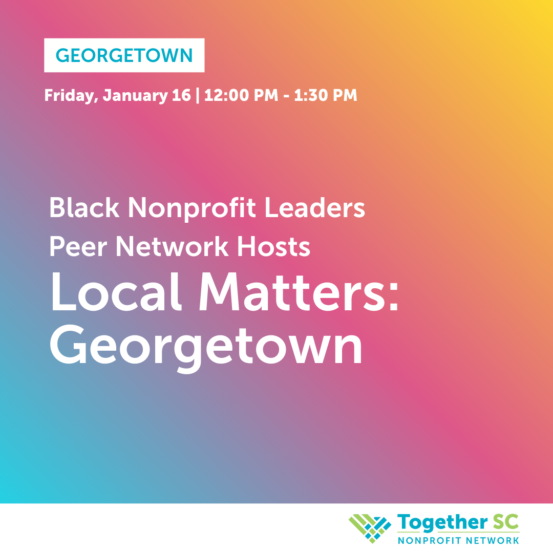 We're introducing Local Matters, the Black Nonprofit Leaders' Group's regional meetups! We invite members of BNLG located in Georgetown and its surrounding areas to join us on January 16 at noon for lunch, networking, and programming centering local needs. We’ll be hosted by Mr. and Mrs. Chatman with Optimism Preventive Services at their community garden. The cost for the event is $15. Spaces are limited.