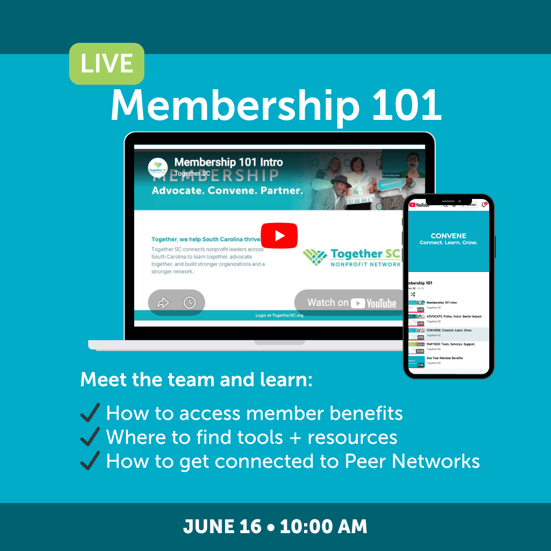 Please join us for our quarterly Membership 101 call where you can get to know your Together SC team and learn about member benefits.