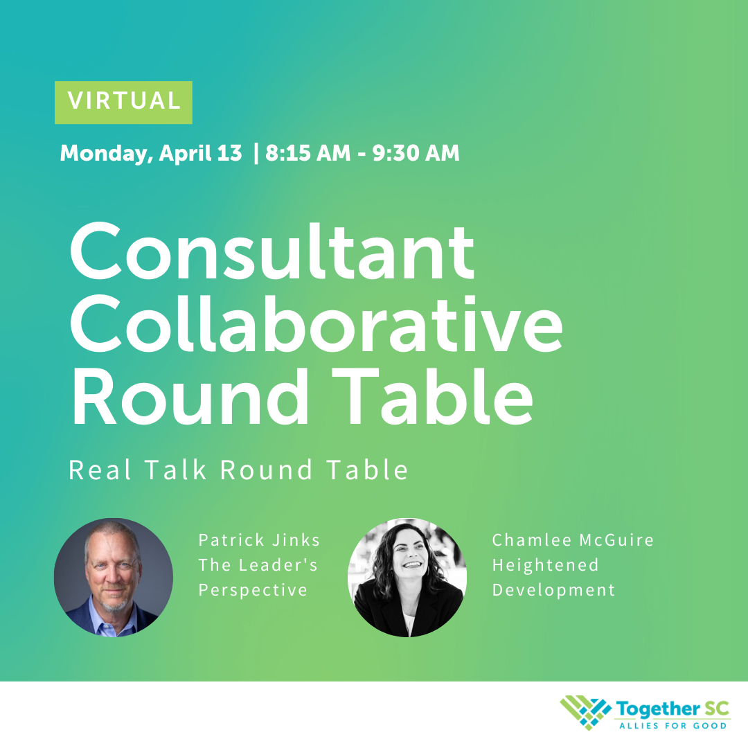 Fresh from Together SC’s Nonprofit Summit, this interactive session invites members of the Consultant Collaborative to reflect and share what they heard from so many leaders at the Summit (or have been hearing throughout the year), and to reimagine how we can best support our clients in the year ahead. Through discussions facilitated by our co-chairs, Patrick Jinks and Chamlee McGuire, we’ll explore emerging needs, surface shared challenges, and co-create priorities for our upcoming learning sessions. Come ready to exchange ideas, name your pain points, and help shape what’s next for our community of practice.