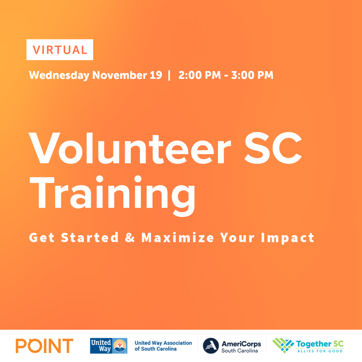 Join us for an interactive training webinar designed for nonprofits that have joined or are interested in joining Volunteer SC, the new free volunteer management platform powered by POINT and brought to you by United Way Association of SC, AmeriCorps SC, and Together SC.